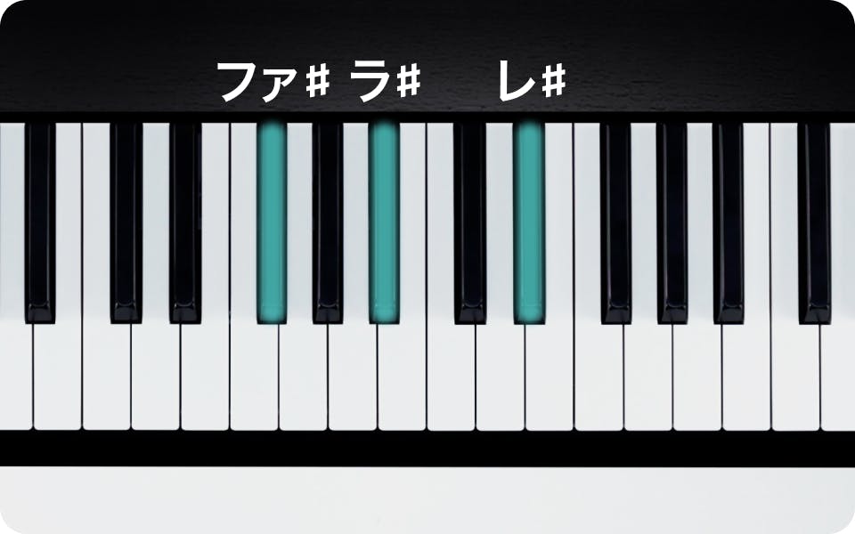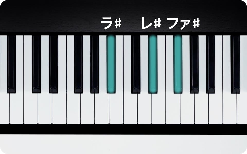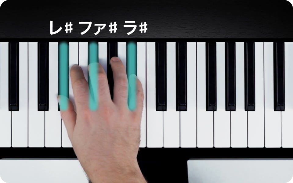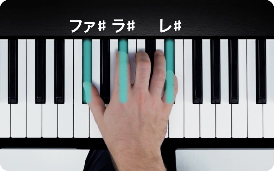 D#マイナーのコードは「D# = レ#」「F# = ファ#」「A# = ラ#」の音で構成されています。右手の場合は、次の指でコードを弾くことができます。