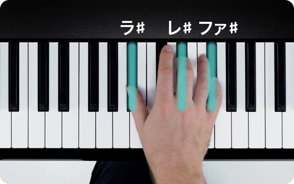 D#マイナーの第二転回形を弾くには、コードの最低音を「ラ#」にします。右手でこの転回形を弾く場合は、次の指を使いましょう。