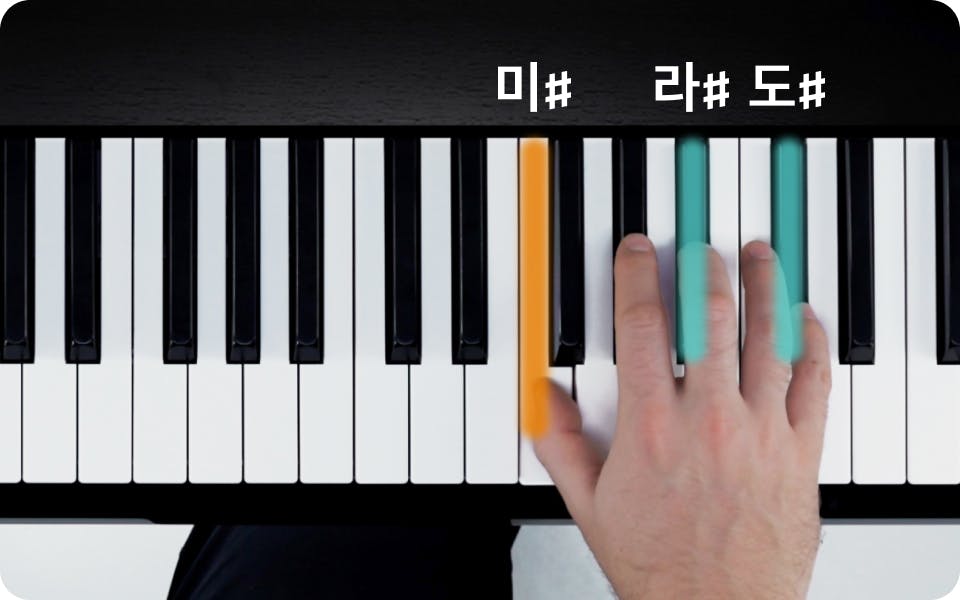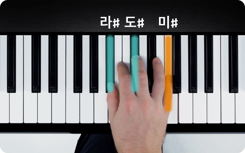 A♯ 마이너 코드의 구성음은 라♯(A♯), 도♯(C♯), 미♯(E♯)입니다. 미♯는 피아노에서 파와 이명동음이란 걸 유의하세요. A♯ 마이너 루트 포지션을 오른손으로 연주할 때 사용하는 손가락은 다음과 같습니다.