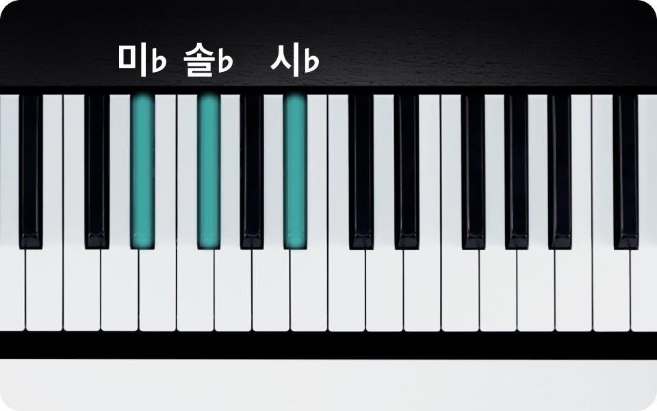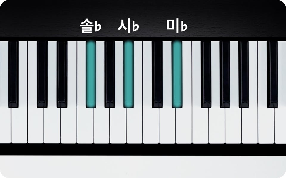 E♭ 마이너 코드의 근음은 미♭(E♭)입니다. 피아노를 위에서 내려다 보면, 검은 건반이 두 개, 세 개씩 나뉘어 펼쳐져 있습니다. 두 개씩 나뉜 검은 건반 중 오른쪽 건반이 바로 미♭입니다. 여기서부터 코드를 쌓아올려 보도록 하죠.