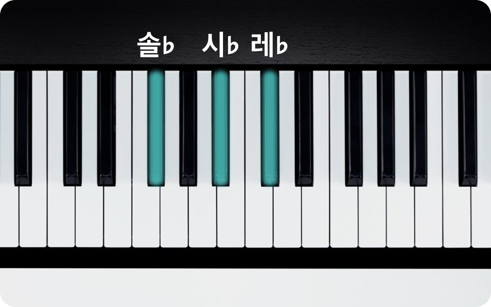 G♭ 메이저 코드의 근음은 솔♭(G♭)입니다. 이를 건반 위에서 찾으려면, 우선 세 개씩 묶인 검은 건반을 주목하세요. 이 중 가장 왼쪽에 있는 검은 건반이 솔♭입니다. 여기서부터 코드를 쌓아올려 보도록 하죠.